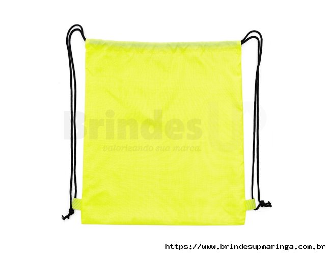 Mochila saco multifuncional em poliéster impermeável com cordões de nylon que servem tanto para fechamento quanto como alças de costas.
