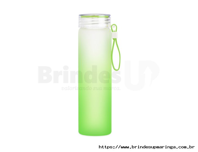 Descrição: Garrafa de vidro jateado bicolor, capacidade de 470ml. Contém alça de silicone.
