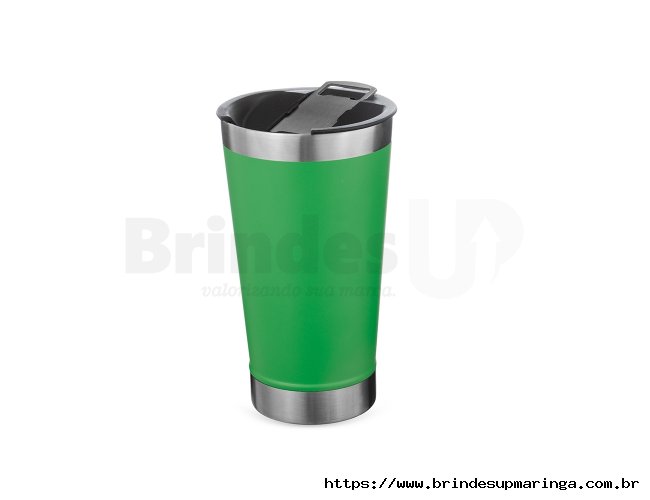Copo térmico de inox com acabamento liso e capacidade 500ml, material livre de BPA. Contém tampa com abridor.