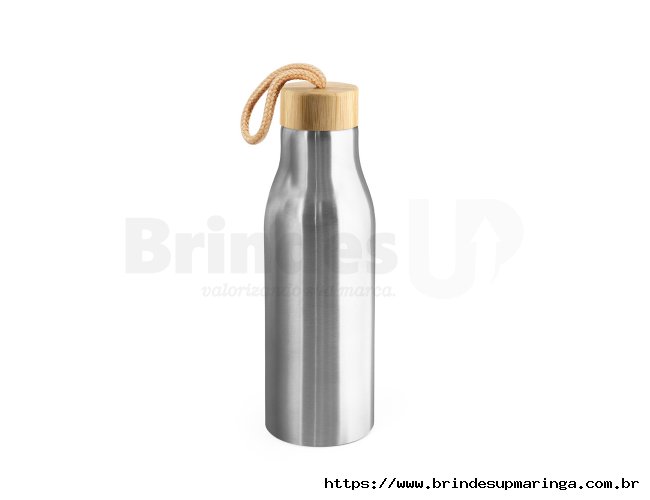 Squeeze em aço inox 90% reciclado, de parede simples e acabamento em mate. A tampa em bambu incorpora uma alça para facilitar o transporte. Capacidade até 570 mL. Fornecido em caixa presente de papel kraft reciclado. Certificação EU Food Grade. A cor e o resultado da impressão nos materiais naturais pode variar entre produtos. ø62 x 220 mm